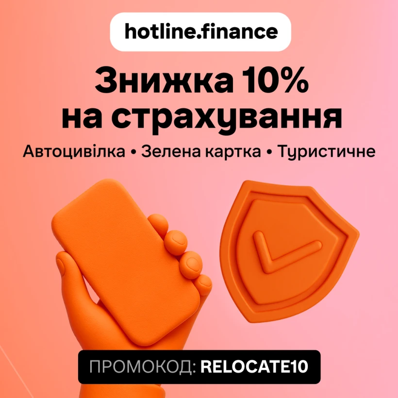 Для читачів Relocate ми підготували приємний бонус — 10% знижку на оформлення поліса через Hotline.finance за промокодом RELOCATE10. Знижка діє до 31 грудня включно.