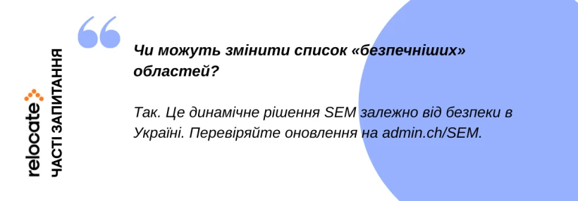Важливо: перелік «придатних для повернення» регіонів визначається Держсекретаріатом з міграції (SEM) і може оновлюватись залежно від безпекової ситуації. Слідкуйте за офіційною сторінкою SEM.