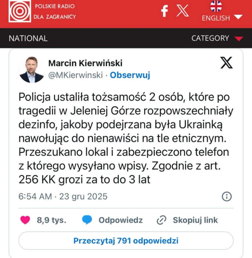 Міністр внутрішніх справ Польщі Марцін Кервінський 23 грудня заявив, що після вбивства дитини в мережі почали поширюватися дописи з неправдивими твердженнями про національність підозрюваної.