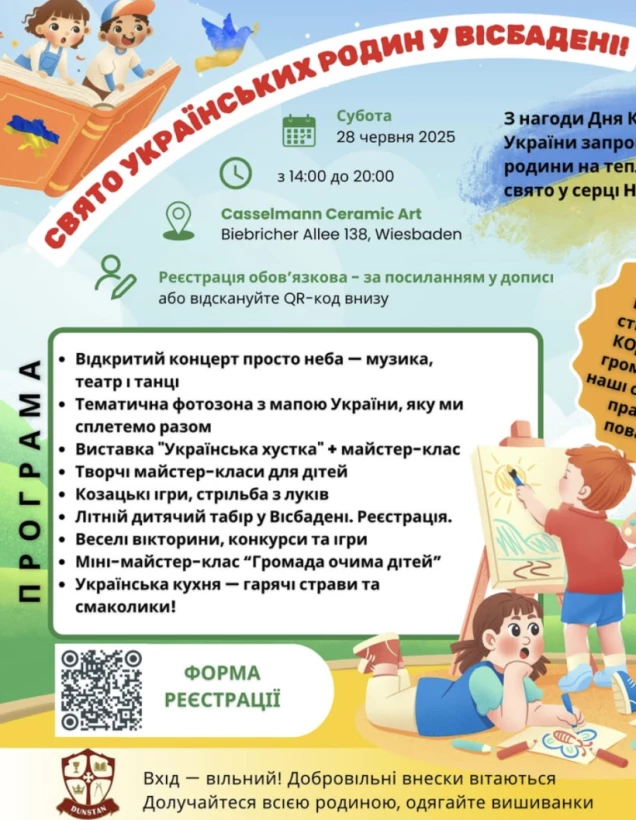 28 червня 2025 року до Дня Конституції України запрошуємо на Свято українських родин у столиці землі Hessen - Вісбаден!! Ми продовжуємо традицію дружніх Родинних свят Єдності, розпочату минулого року. 🎉